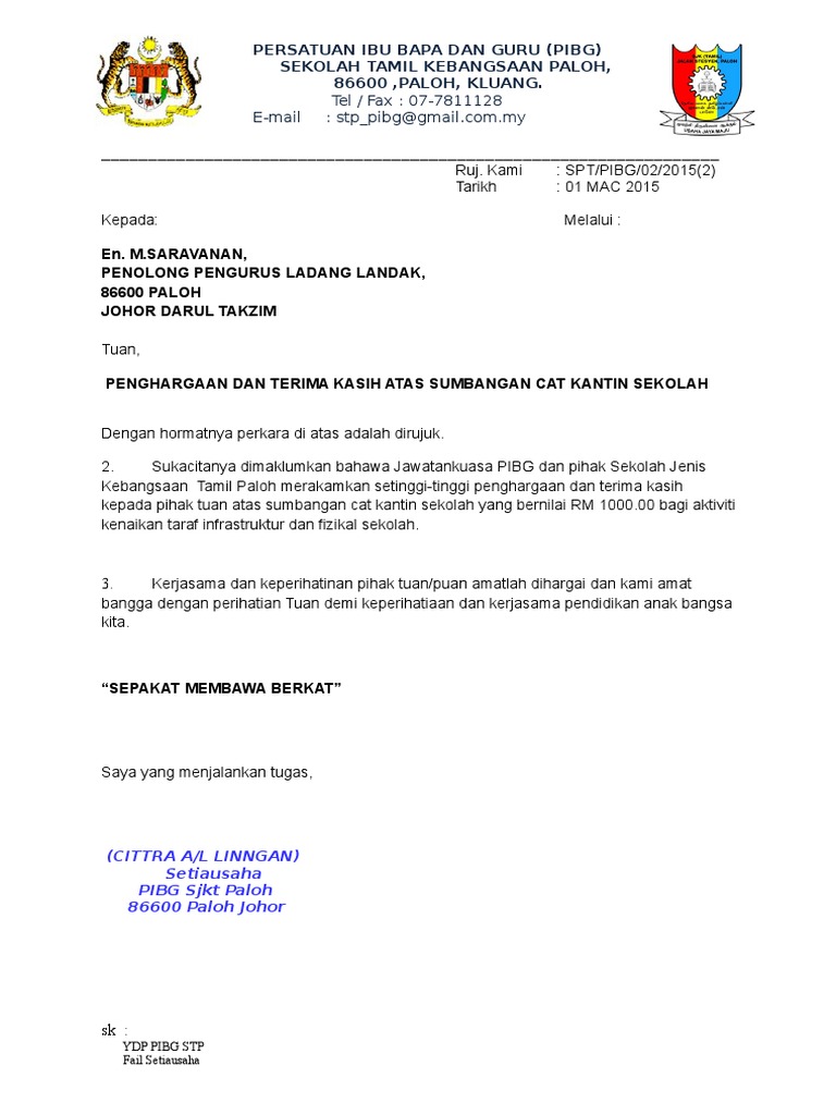 Contoh surat penghargaan tamat perkhidmatan surat 35 cute766. Ungkapan semacam ini sebaiknya disampaikan secara formal melalui surat resmi, karena biasanya melibatkan lembaga. Surat penghargaan dan terima kasih kepada sponsor. Contoh surat terima kasih atas sumbangan have a graphic associated with the other contoh surat terima kasih atas sumbangan it also will feature a picture of a kind that may be observed in the gallery of contoh surat terima kasih atas sumbangan. Surat rasmi terima kasih contoh rasmi suh. Kumpulan contoh surat terima kasih atas sumbangan yang benar 2019. Contoh surat ucapan terima kasih adalah surat yang dibuat oleh seseorang dan. Contoh surat penghargaan dan terima kasih atas sumbangan wang. Contoh surat penghargaan dan terima kasih atas sumbangan wang. Surat ucapan terima kasih ini tidak hanya dapat dibuat atas nama pribadi namun juga dapat mengatasnamakan sebuah kelompok instansi atau bahkan sebuah perusahaan. The collection that comprising chosen picture and the best among others. Simpan surat perhargaan dan terima kasih atas sumbangan untuk nanti. Contoh surat ucapan terima kasih atas sumbangan bantuan dana yang diberikan.
